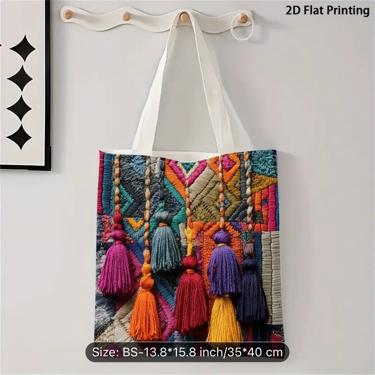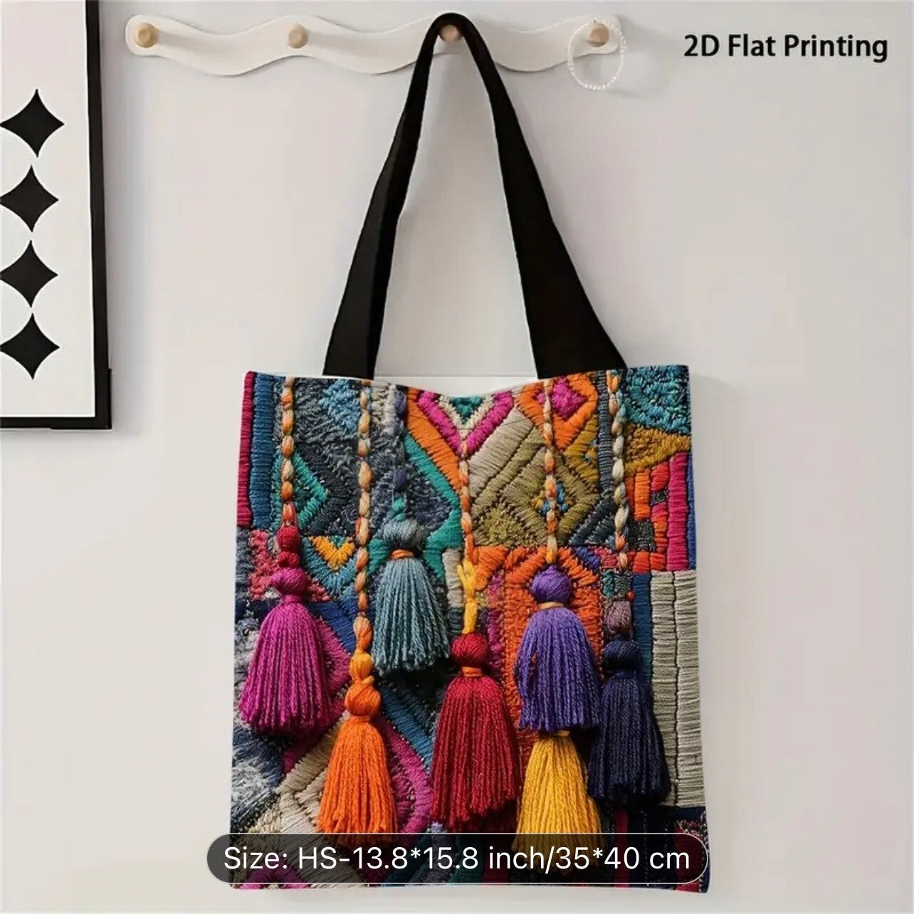 A Colorful Embroidered Bag with Vibrant Geometric Designs And Tassels, Ideal for Brightening Up Your Accessory Collection.